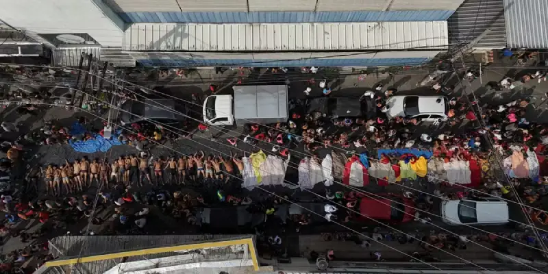Imagem de drone mostra corpos levados a praça no Complexo da Penha, na Zona Norte do Rio de Janeiro, no dia 29 de outubro de 2025. — Foto: Ricardo Moraes/Reuters